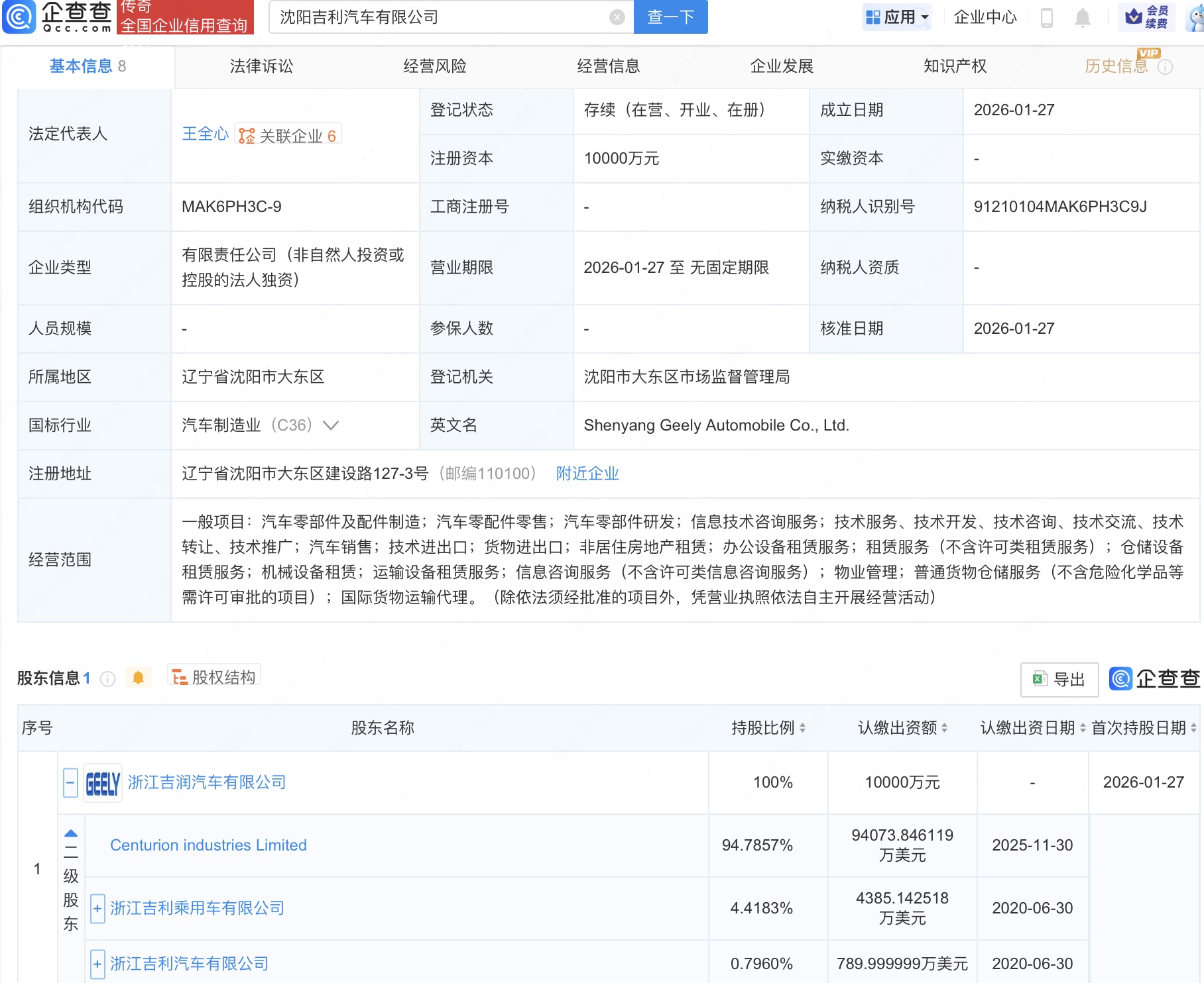企查查APP显示,近日,沈阳吉利汽车有限公司成立,法定代表人为王全心,注册资本1亿人民币,经营范围包括汽车零部件及配件制造、汽车零配件零售、汽车零部件研发、信息技术咨询服务等。企查查股权穿透显示,该公司由浙江吉润汽车有限公司全资持股。