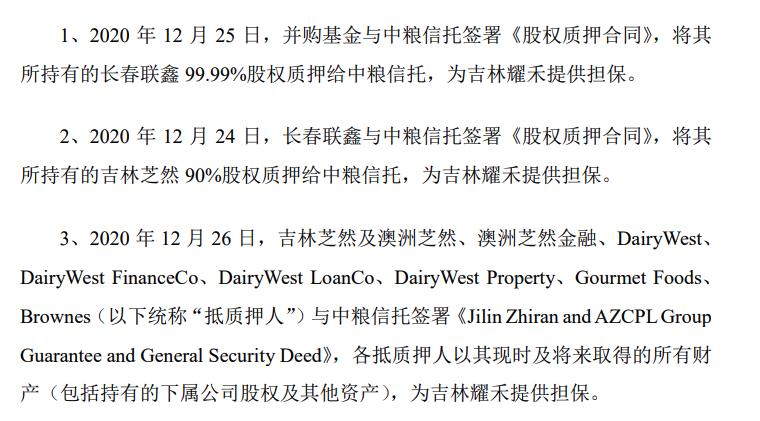 而在此期间,即2020年12月24日,吉林耀禾与中粮信托有限责任公司(以下简称“中粮信托”)签署《信托贷款合同》,中粮信托将向吉林耀禾累计发放本金不超过7亿元的贷款。同时,为担保吉林耀禾的还款义务及其他各项义务的履行,上海祥民股权投资基金及其下属控制主体提供提供了连带责任保证及相关财产的抵押、质押担保,具体如下图。