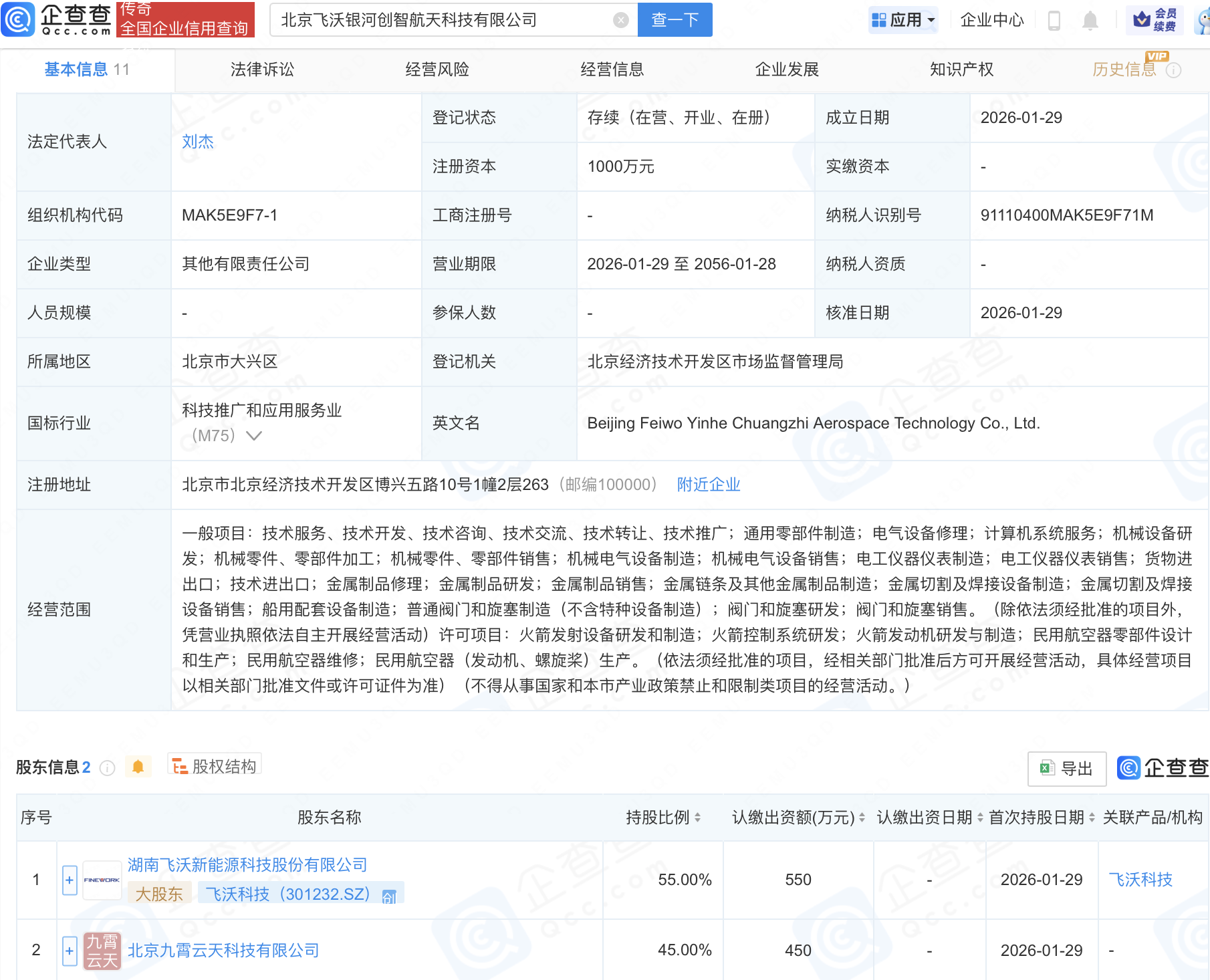 企查查APP显示,近日,北京飞沃银河创智航天科技有限公司成立,注册资本1000万元,经营范围包含:火箭发射设备研发和制造;火箭控制系统研发;火箭发动机研发与制造;民用航空器零部件设计和生产等。企查查股权穿透显示,该公司由飞沃科技(301232)、北京九霄云天科技有限公司共同持股。