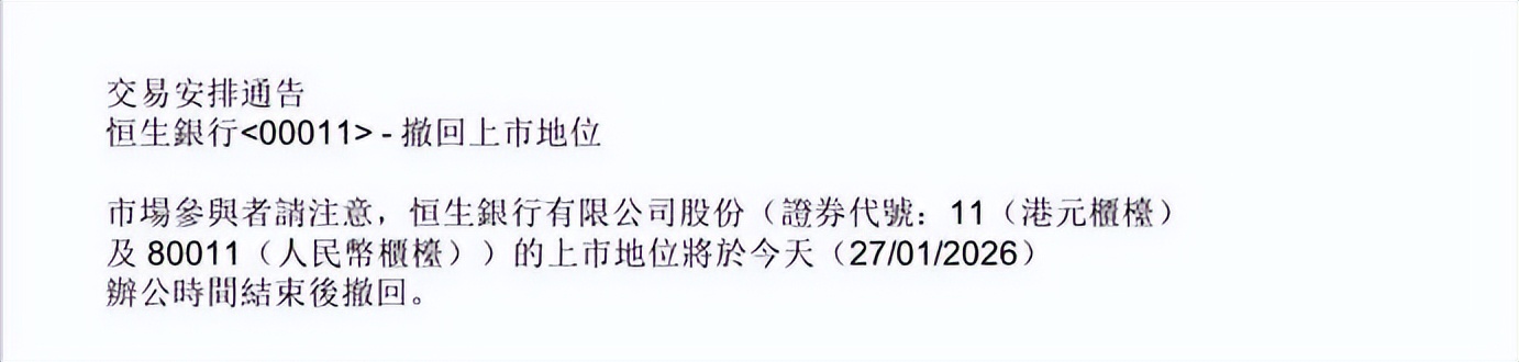 1月27日,恒生银行在香港联合交易所的上市地位正式撤销,意味着这家拥有53年上市历史的金融巨头正式告别公开市场。