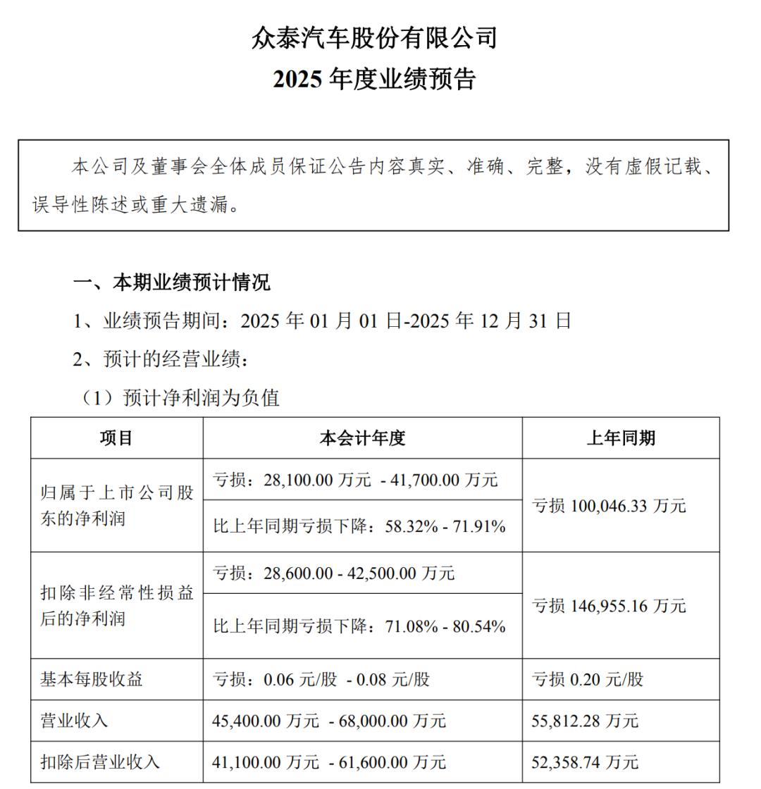 1月28日,众泰汽车发布2025年度业绩预告称,