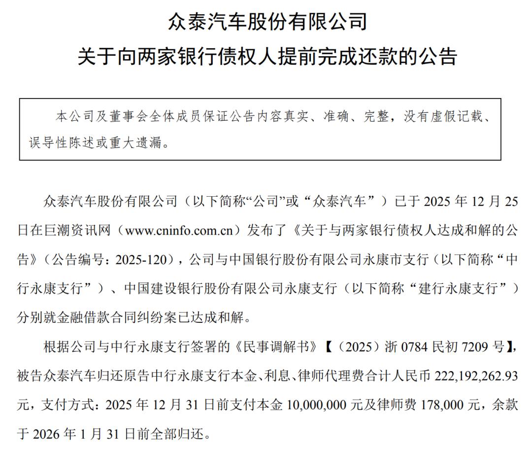 1月26日,众泰发布公告宣布,已提前5天全额偿还中行永康支行剩余债务212,014,262.93元、建行永康支行剩余债务172,833,512.50元,合计约3.85亿元,顺利履行完毕与两家银行此前达成的调解约定。