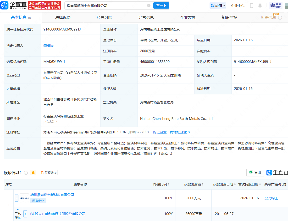 企查查APP显示,近日,海南晨盛稀土金属有限公司成立,法定代表人为李雅民,注册资本为2000万元,经营范围包含:稀有稀土金属冶炼;有色金属合金制造;金属材料制造;有色金属压延加工;新材料技术研发等。企查查股权穿透显示,该公司由盛和资源(600392)间接全资持股。