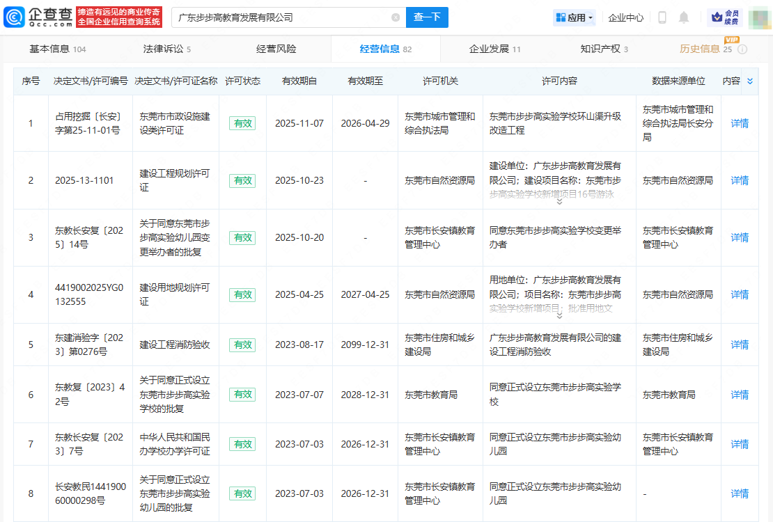 据悉,广东步步高教育发展有限公司主要从事教育用地租赁业务,曾取得东莞市步步高实验学校、东莞市步步高实验幼儿园相关许可。