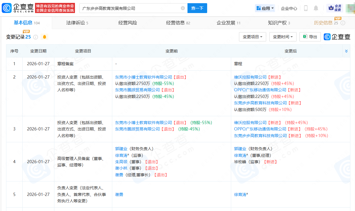 企查查APP显示,近日,广东步步高教育发展有限公司发生工商变更,原股东东莞市小博士教育软件有限公司、东莞市鹏派贸易有限公司退出,新增OPPO广东移动通信有限公司、VIVO关联公司维沃控股有限公司、东莞步步高教育科技有限公司为股东。