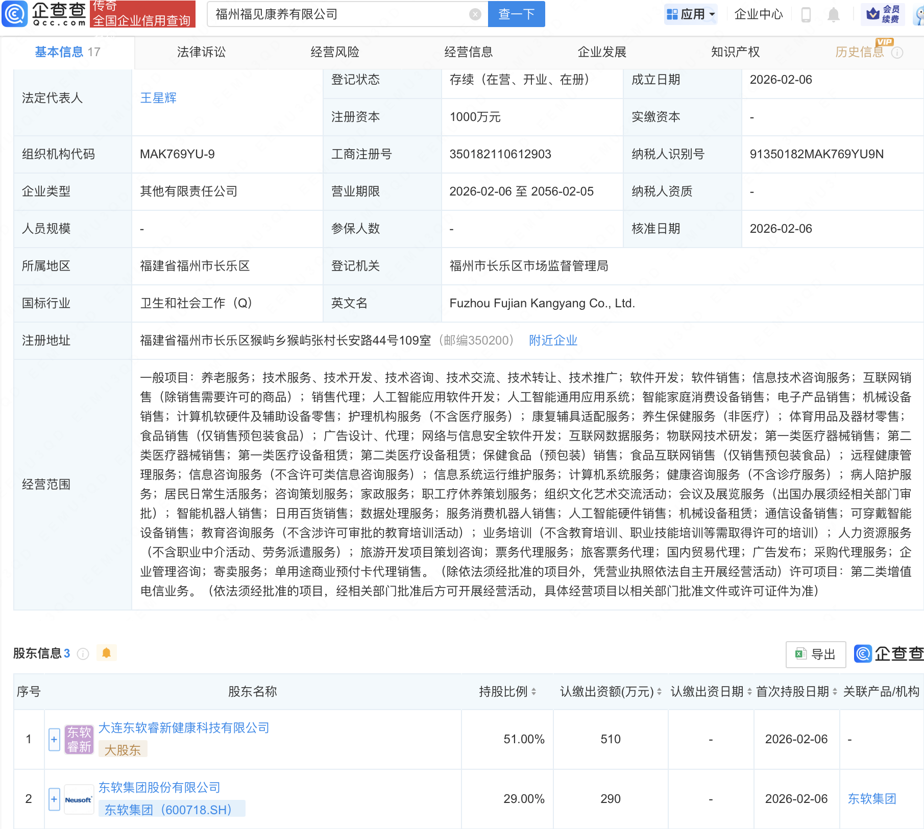 企查查APP显示,近日,福州福见康养有限公司成立,经营范围包含:养老服务;人工智能应用软件开发;人工智能通用应用系统;智能家庭消费设备销售等。企查查股权穿透显示,该公司由东软集团(600718)等共同持股。