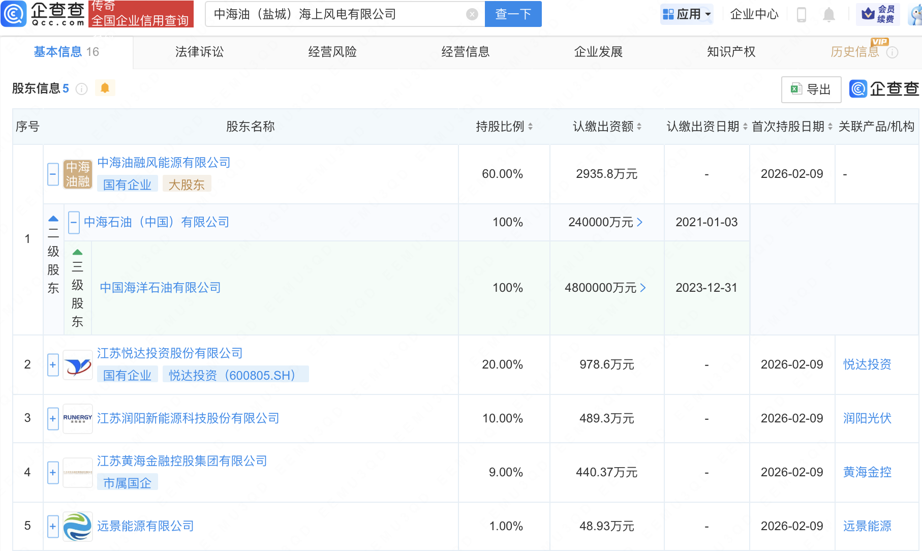 企查查APP显示,近日,中海油(盐城)海上风电有限公司成立,经营范围包含:海上风电相关系统研发;发电技术服务;太阳能发电技术服务;风力发电技术服务等。企查查股权穿透显示,该公司由中国海油(600938)旗下中海油融风能源有限公司、悦达投资(600805)、远景能源有限公司等共同持股。