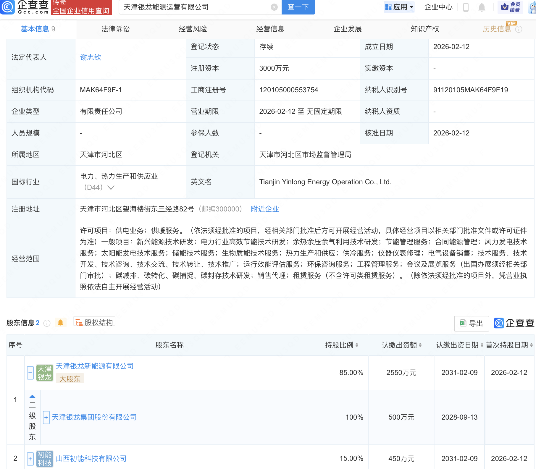 企查查APP显示,近日,天津银龙能源运营有限公司成立,注册资本3000万元,经营范围包含:太阳能发电技术服务;储能技术服务;生物质能技术服务;热力生产和供应等。企查查股权穿透显示,该公司由银龙股份(603969)全资子公司天津银龙新能源有限公司等共同持股。