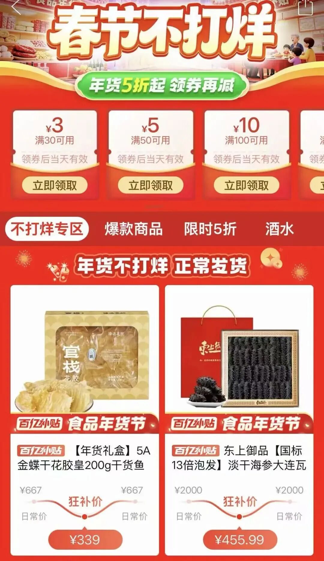 其中“超级加倍补”重点倾斜品质农货、特色年货与国货品牌,部分商品最高享5折优惠。