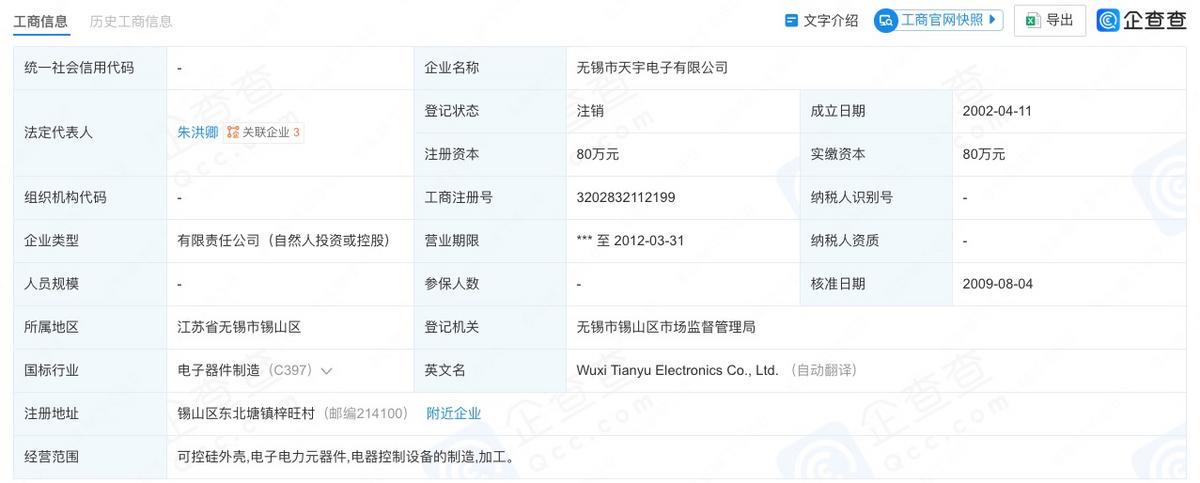 《民商财经》在企信网未搜索到天宇电子的资料。企查查存续记录显示,天宇电子成立于2002年,注销于2012年,实控人、大股东名为朱洪卿,持股40.25%;第二大股东是陈国贤,持股38.75%。企业经营范围包含:可控硅外壳,电子电力元器件,电器控制设备的制造、加工。