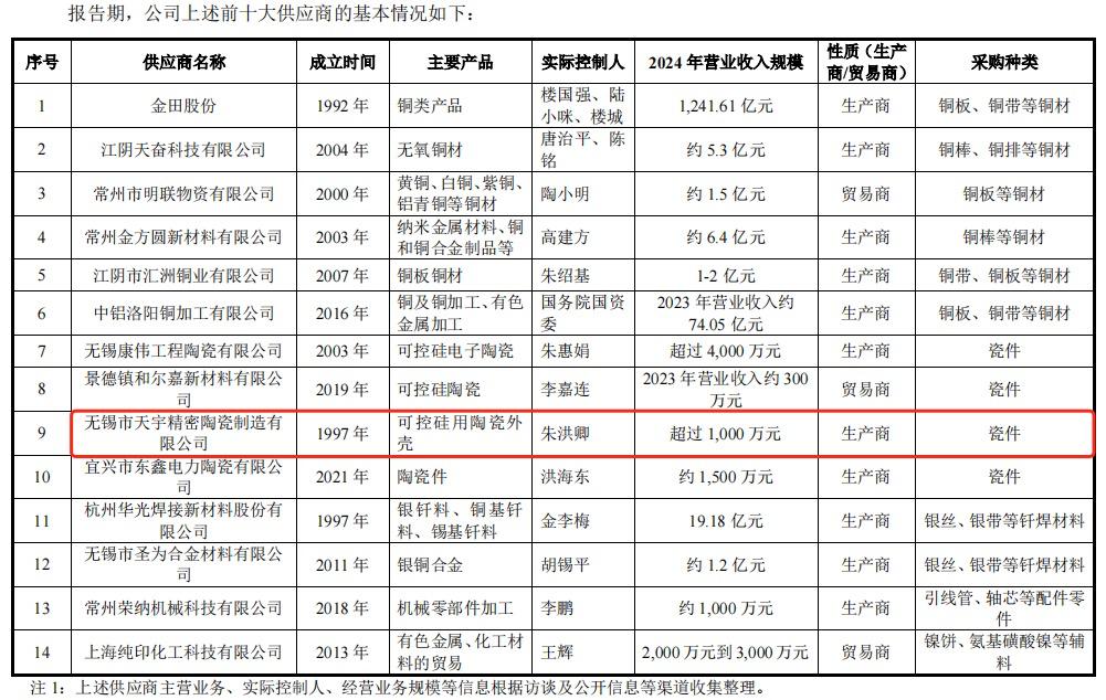 企查查还显示,朱洪卿的关联企业有三家,其中包括无锡市天宇精密陶瓷制造有限公司(下称:天宇精密)。值得一提的是,天宇精密出现在赛英电子问询回复披露的前十大供应商名单中。据问询回复,天宇精密主要产品为可控硅用陶瓷外壳,其作为生产商向赛英电子供应瓷件。2022年,赛英电子向天宇精密的采购额为358.07万元,占当期采购总额的2.42%。