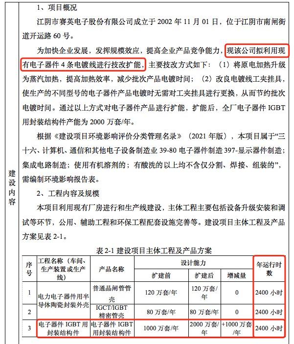 2025年4月1日,江阴市人民政府网站对赛英电子“年新增1000万套电子器件IGBT用封装结构件技改扩能项目”(下称:技改项目)的环评文件进行公示。该环评文件编制于2025年3月,文件内容显示,技改项目体量较小,施工期仅一个月,不新建产线,而是对公司现有的电子器件4条电镀线进行技改,拟将电子器件IGBT用封装结构件的产能从1,000万套/年扩充至2,000万套/年。电子器件IGBT用封装结构件即散热基板。赛英电子没有子公司,技改项目环评提到的4条电镀线恰好与招股书中基板车间的4条电镀线对应。