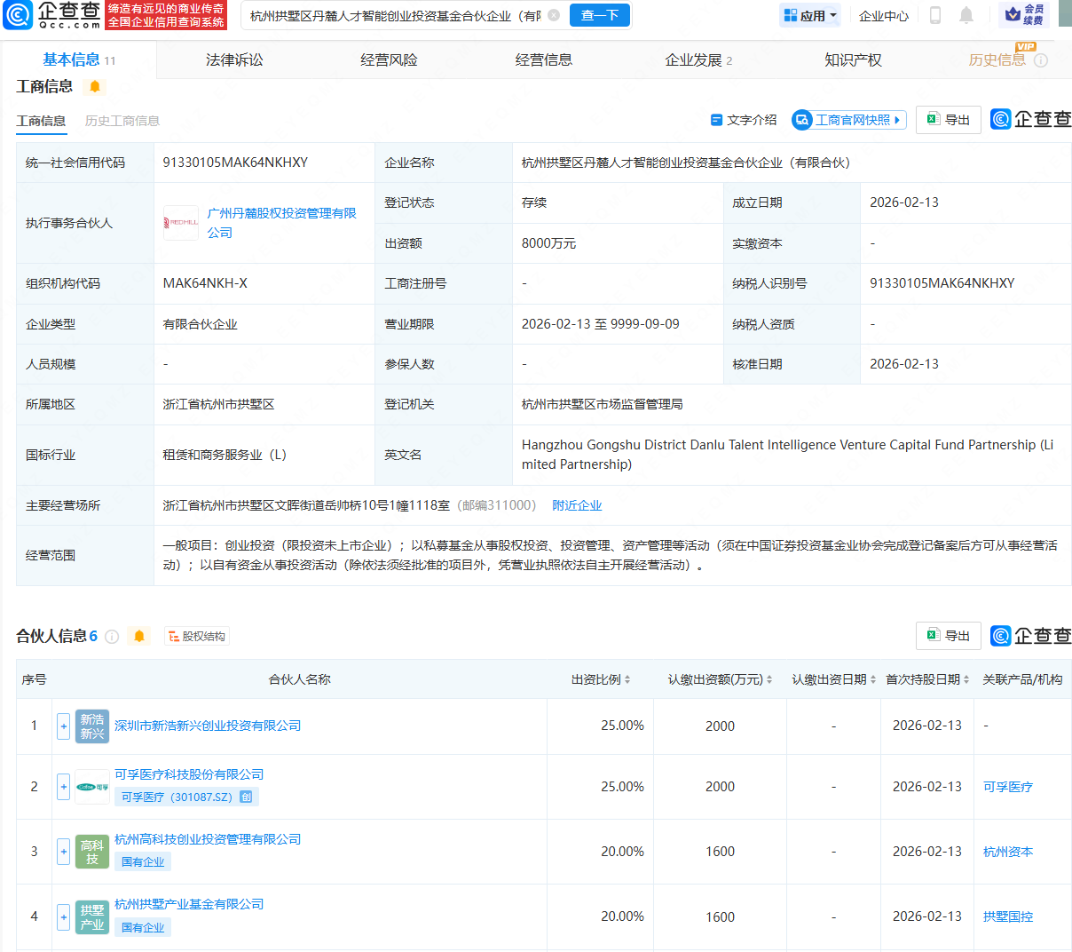 企查查APP显示,近日,杭州拱墅区丹麓人才智能创业投资基金合伙企业(有限合伙)成立,出资额8000万元,经营范围包含:创业投资(限投资未上市企业);以私募基金从事股权投资、投资管理、资产管理等活动等。企查查股权穿透显示,该合伙企业由深圳市新浩新兴创业投资有限公司、可孚医疗(301087)、杭州高科技创业投资管理有限公司等共同持股。
