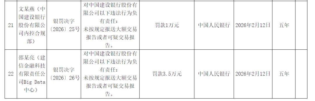 据悉,此次对建设银行的处罚决定书编号为银罚决字〔2026〕5号,