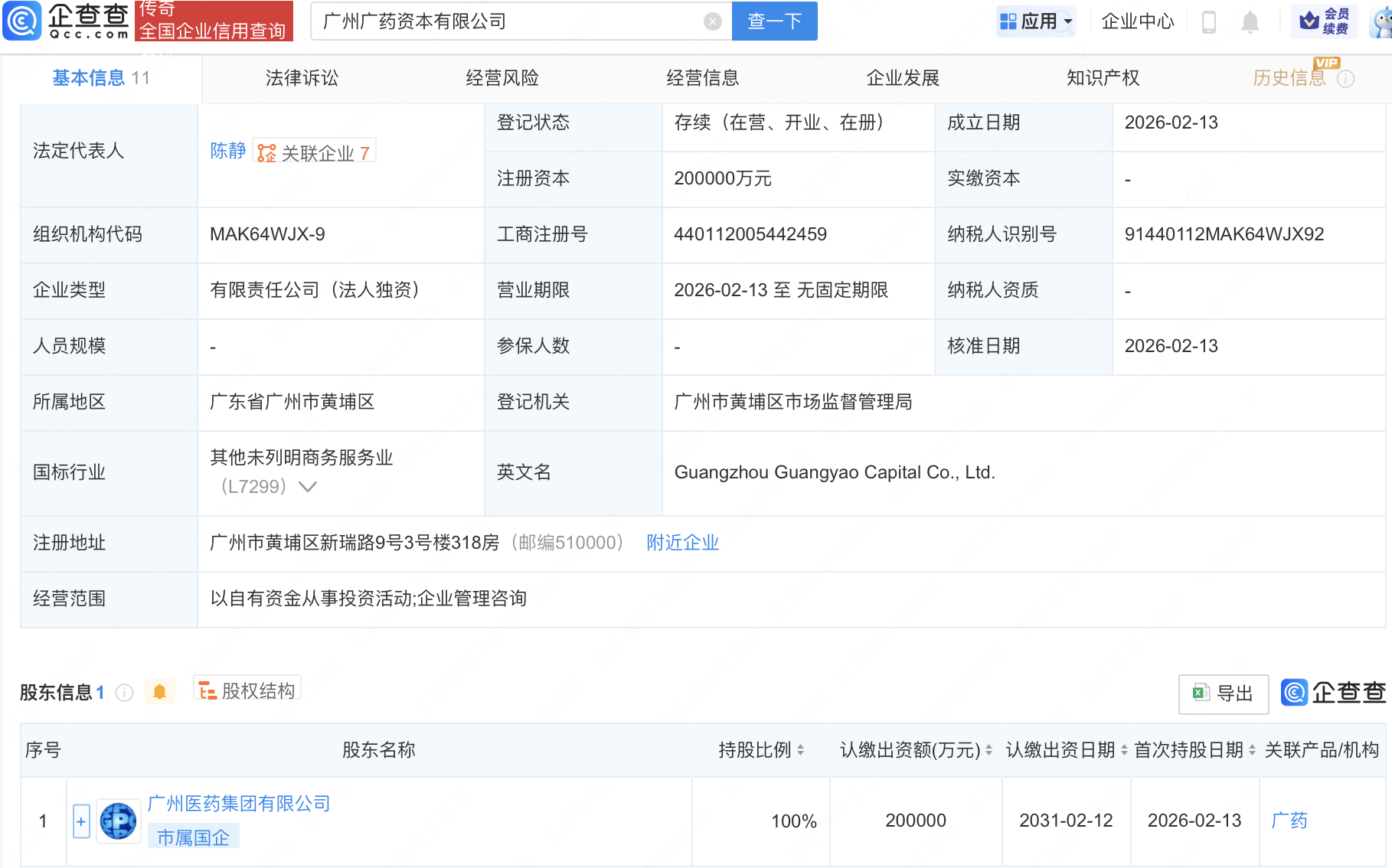 企查查APP显示,近日,广州广药资本有限公司成立,注册资本20亿元,经营范围包含:以自有资金从事投资活动;企业管理咨询。企查查股权穿透显示,该公司由广州医药集团有限公司全资持股。