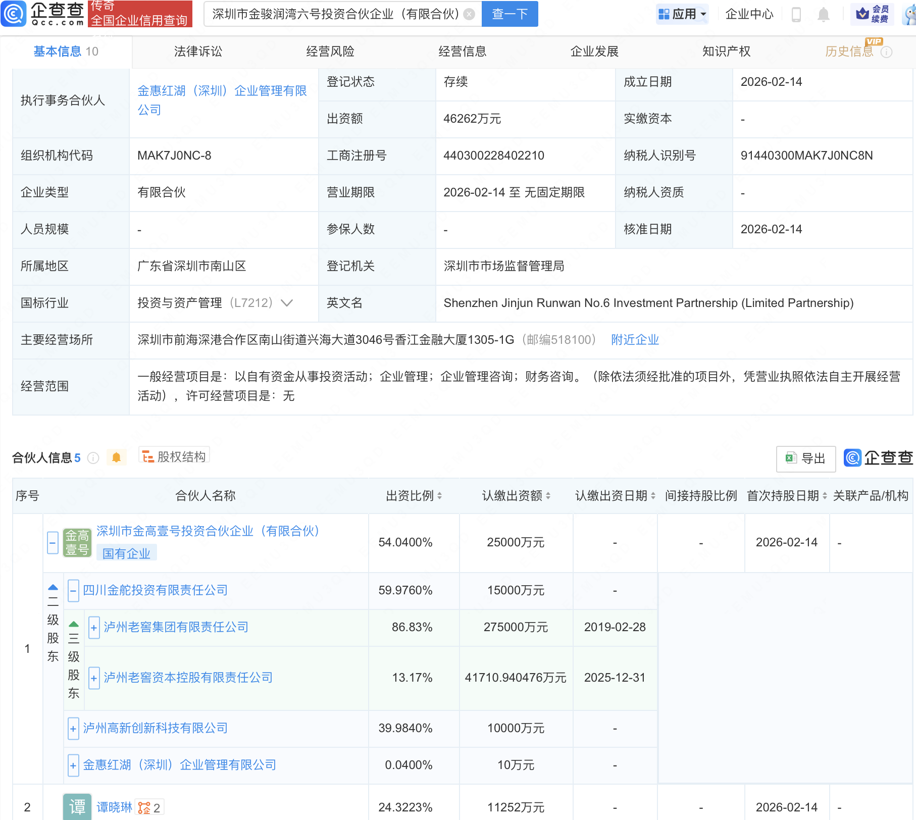 企查查APP显示,近日,深圳市金骏润湾六号投资合伙企业(有限合伙)成立,出资额4.6亿元,经营范围包含:以自有资金从事投资活动;企业管理;企业管理咨询;财务咨询。企查查股权穿透显示,该企业由泸州老窖集团有限责任公司旗下深圳市金高壹号投资合伙企业(有限合伙)等共同出资。