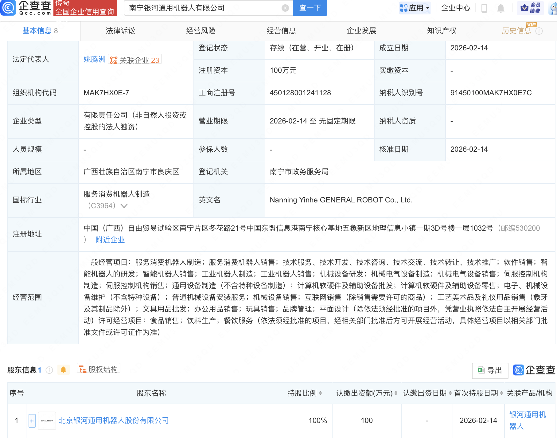 企查查APP显示,近日,南宁银河通用机器人有限公司成立,经营范围包含:智能机器人的研发;智能机器人销售;工业机器人制造;工业机器人销售等。企查查股权穿透显示,该公司由北京银河通用机器人股份有限公司全资持股。