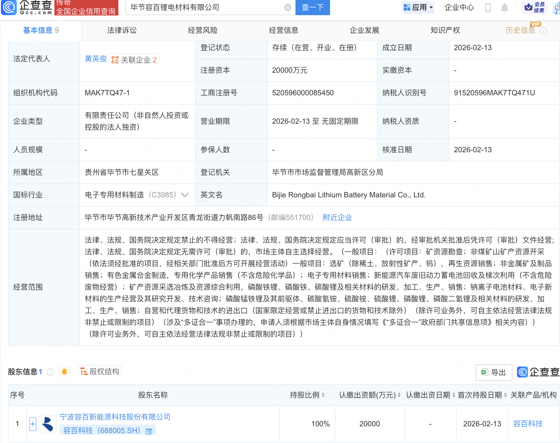企查查APP显示,近日,毕节容百锂电材料有限公司成立,注册资本2亿元,经营范围包含:磷酸铁锂、磷酸铁、碳酸锂及相关材料的研发、加工、生产、销售;钠离子电池材料、电子新材料的生产经营及其研究开发、技术咨询等。企查查股权穿透显示,该公司由容百科技(688005)全资持股。