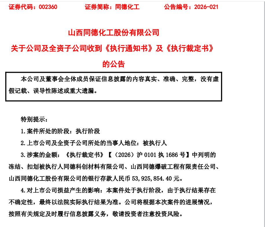 一审判决生效后,因未按要求履行给付义务,2026年1月,同德化工及同德科创收到青岛市崂山区人民法院下发的《执行通知书》,被限十日内履行判决确定的全部义务,同时需承担15.38万元执行费。此次执行文书的送达,意味着该案正式进入强制执行环节,公司及子公司的银行存款随之被冻结、扣划,用于清偿相关债务。