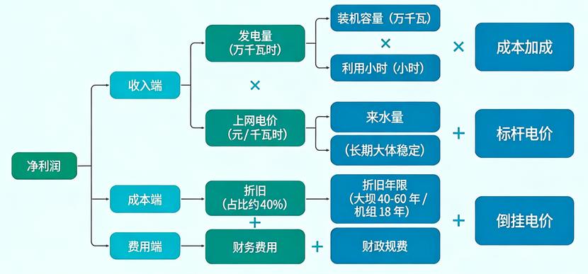 参考长江电力提供的水电企业盈利模式图,水电企业收入端上,营收=发电量*上网电价,发电量(万千瓦时)=装机容量(万千瓦)*利用小时数(小时),结合之后营业收入=利用小时数*装机容量*上网电价。