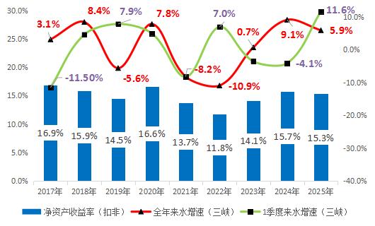 观察长江电力2017-2025年来水情况与经营效率对比图,可以发现经营效率与年度来水增速具有较强正相关性,就是来水越多→发电量越多→营收越高→利润越高。20年、24年来水增速较高年份对应较高净资产收益率、18%以上净利润增速,19年、21年、22年来水偏枯年份对应企业净资产收益率低点、4%以上净利润降幅,年度来水丰枯是影响企业利润的关键因素。