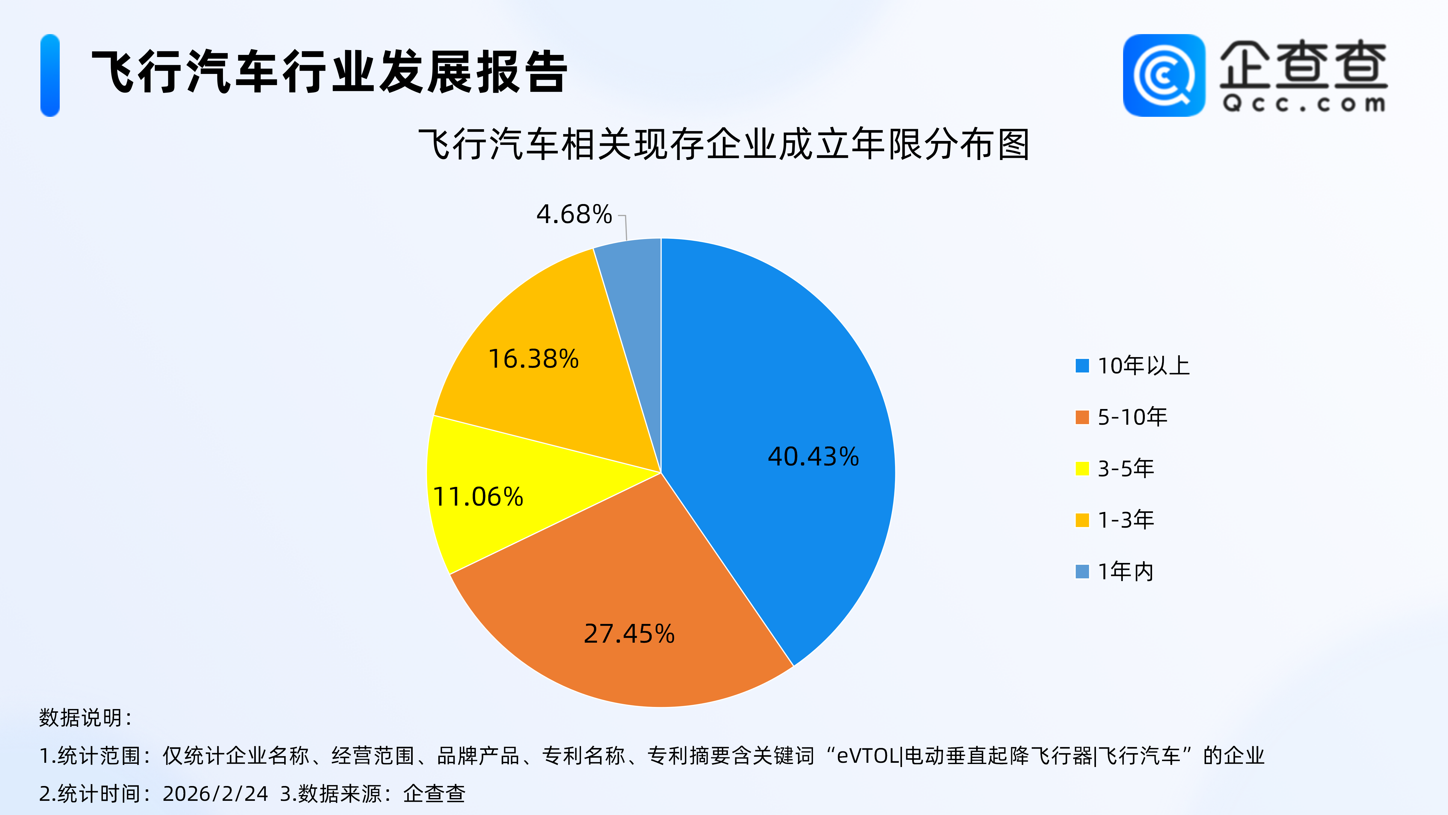企查查数据显示,成立年限方面,国内飞行汽车相关现存企业中,超4成相关企业成立10年以上,占比达40.43%。成立于1年内的相关企业,占比不足5%,达4.68%。