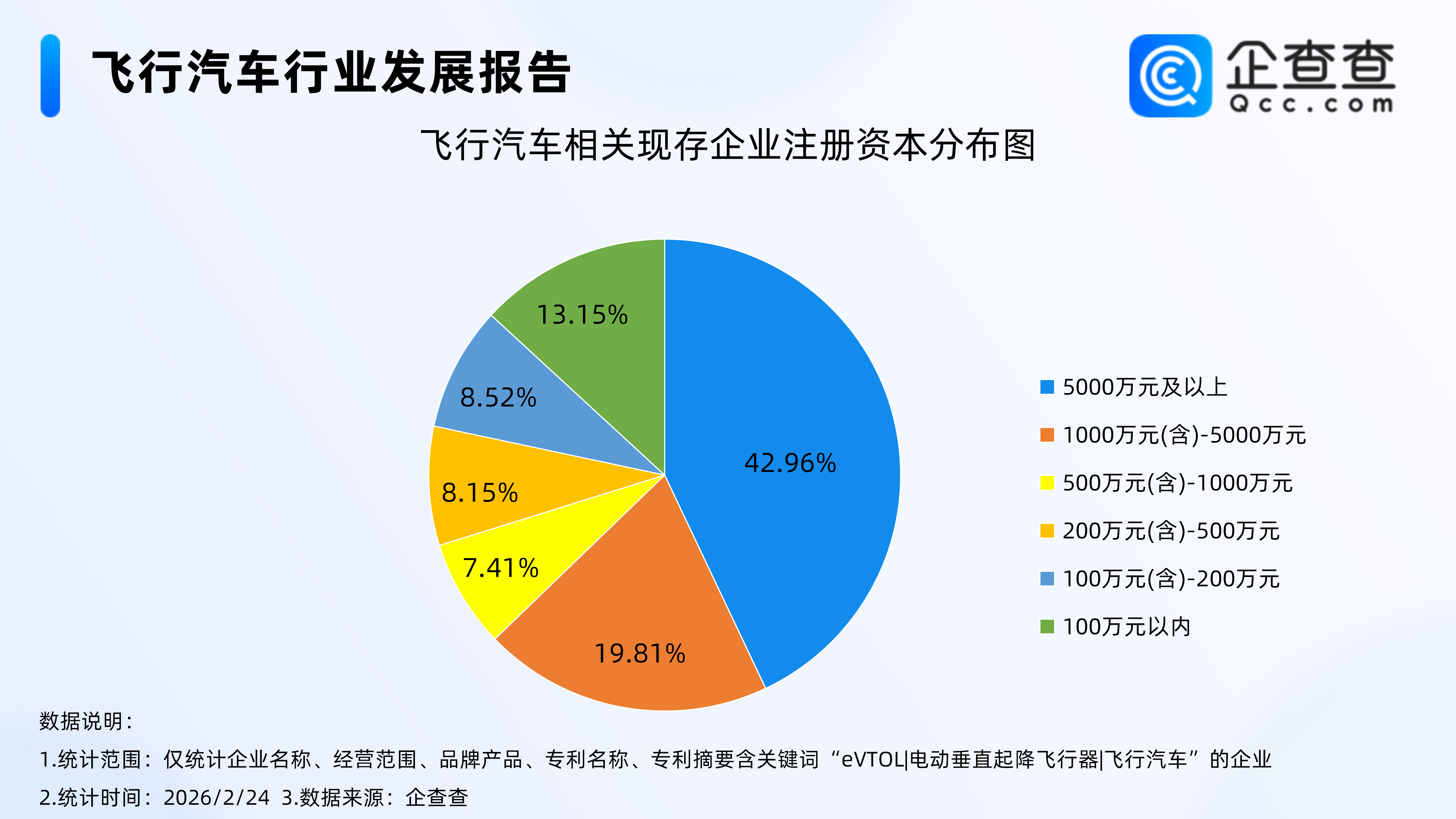 企查查数据显示,注册资本方面,国内飞行汽车相关现存企业多为重资本企业,注册资本在5000万元及以上的相关企业最多,占比达42.96%,其次为,注册资本在1000万元(含)-5000万元的相关企业,占比达19.81%。