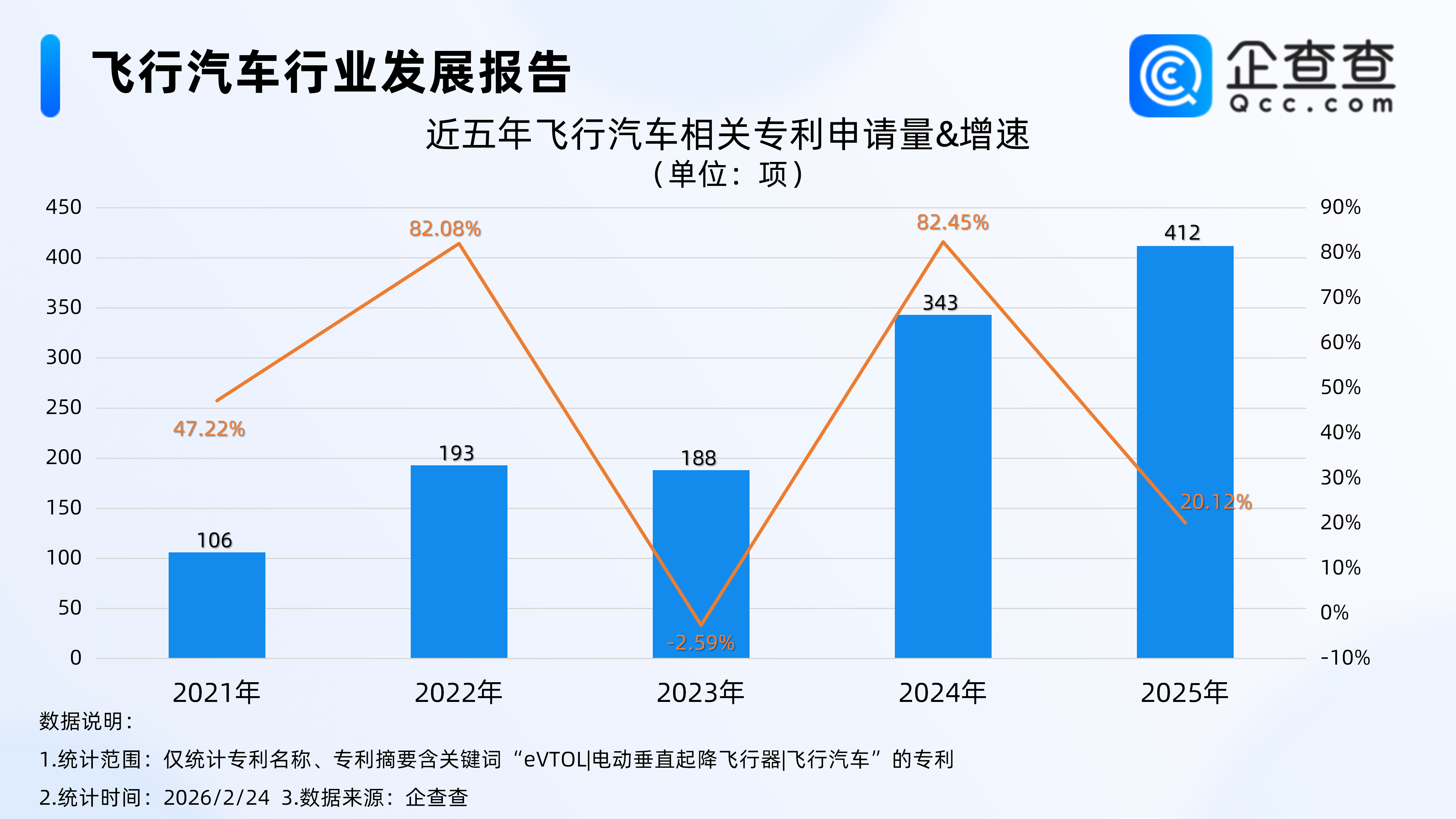 企查查数据显示,专利方面,截至目前,国内飞行汽车相关专利达1707项,其中超7成相关专利申请于近五年(2021年及以后)。其中2024年、2025年飞行汽车相关专利申请量连续两年超300项,2025年相关专利申请量达412项,同比增长20.12%。
