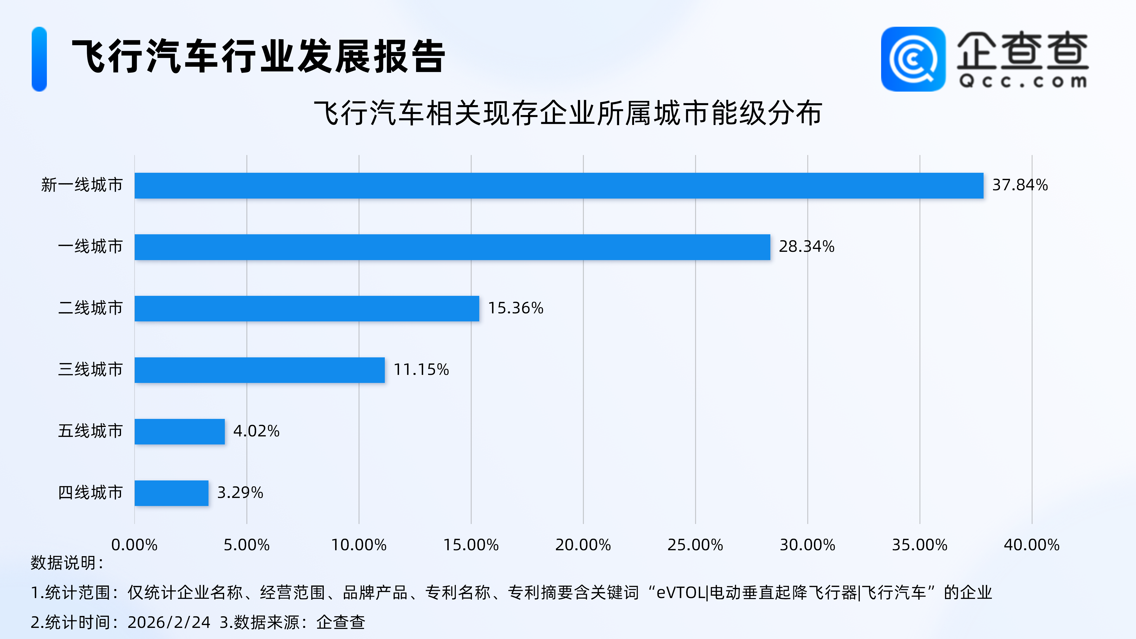 企查查数据显示,截至2月24日,国内飞行汽车相关企业现存量达547家,近7成相关企业位于新一线城市及一线城市。其中位于新一线的相关企业最多,占比达37.84%,位于一线城市的相关企业,占比达28.34%。位于五线、四线城市的相关企业占比不足10%。