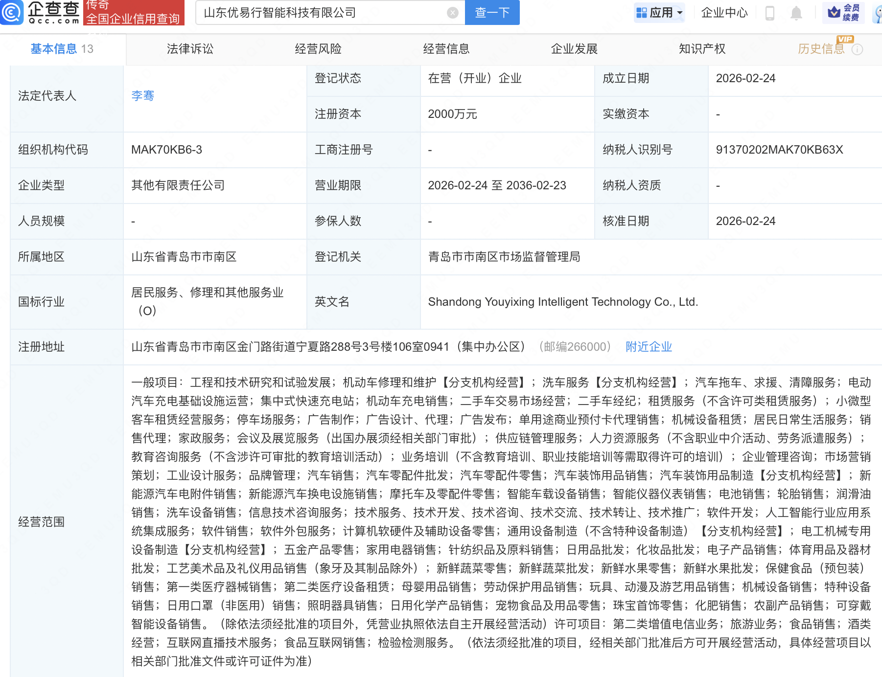 企查查APP显示,近日,山东优易行智能科技有限公司成立,注册资本2000万元,经营范围包含:人工智能行业应用系统集成服务;软件销售;软件外包服务;计算机软硬件及辅助设备零售等。企查查股权穿透显示,该公司由中国石化(600028)旗下中国石化销售股份有限公司等共同持股。