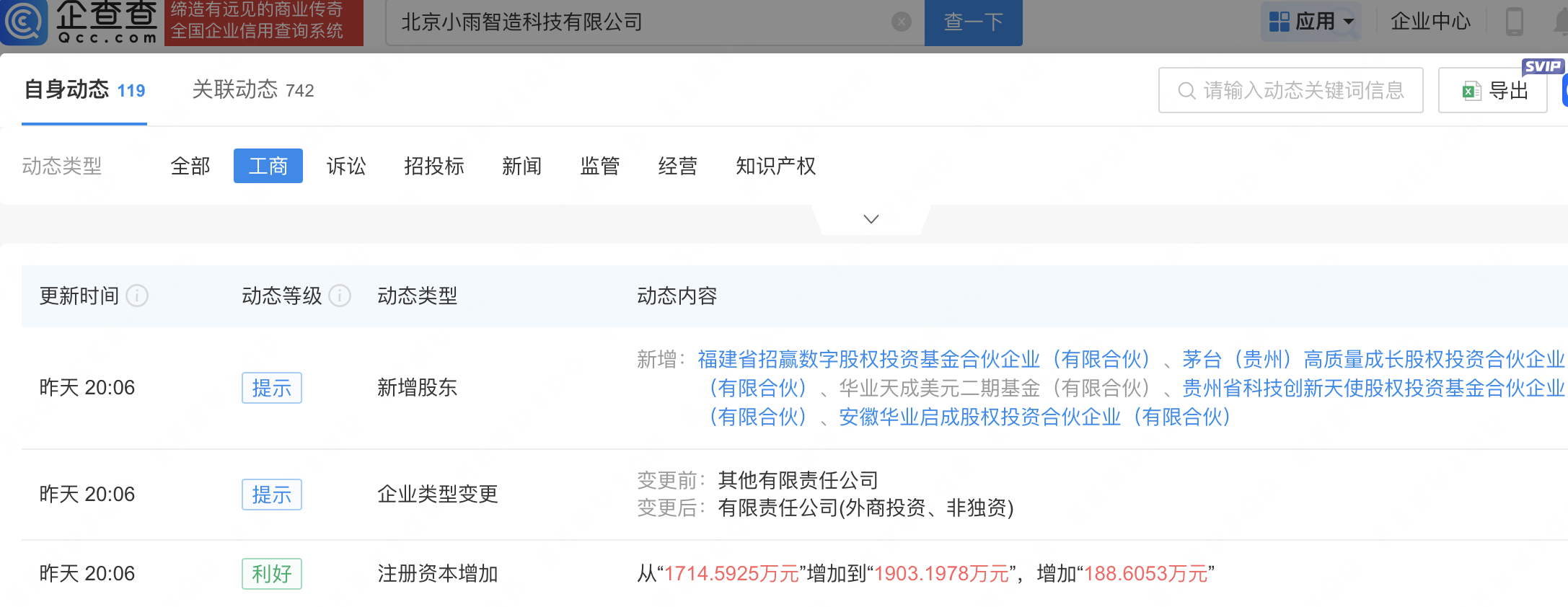企查查APP显示,近日,北京小雨智造科技有限公司发生工商变更,新增茅台(贵州)高质量成长股权投资合伙企业(有限合伙)等为股东,同时注册资本增至1903.2万元。企查查信息显示,该公司成立于2023年,经营范围包含:智能机器人的研发;智能机器人销售;人工智能基础软件开发;人工智能通用应用系统等。据其官网,小雨智造是一家一脑多形的具身机器人平台公司。