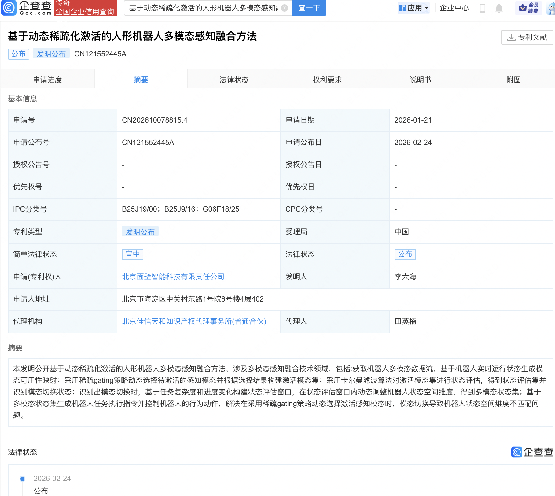 面壁智能公布人形机器人多模态感知融合相关专利