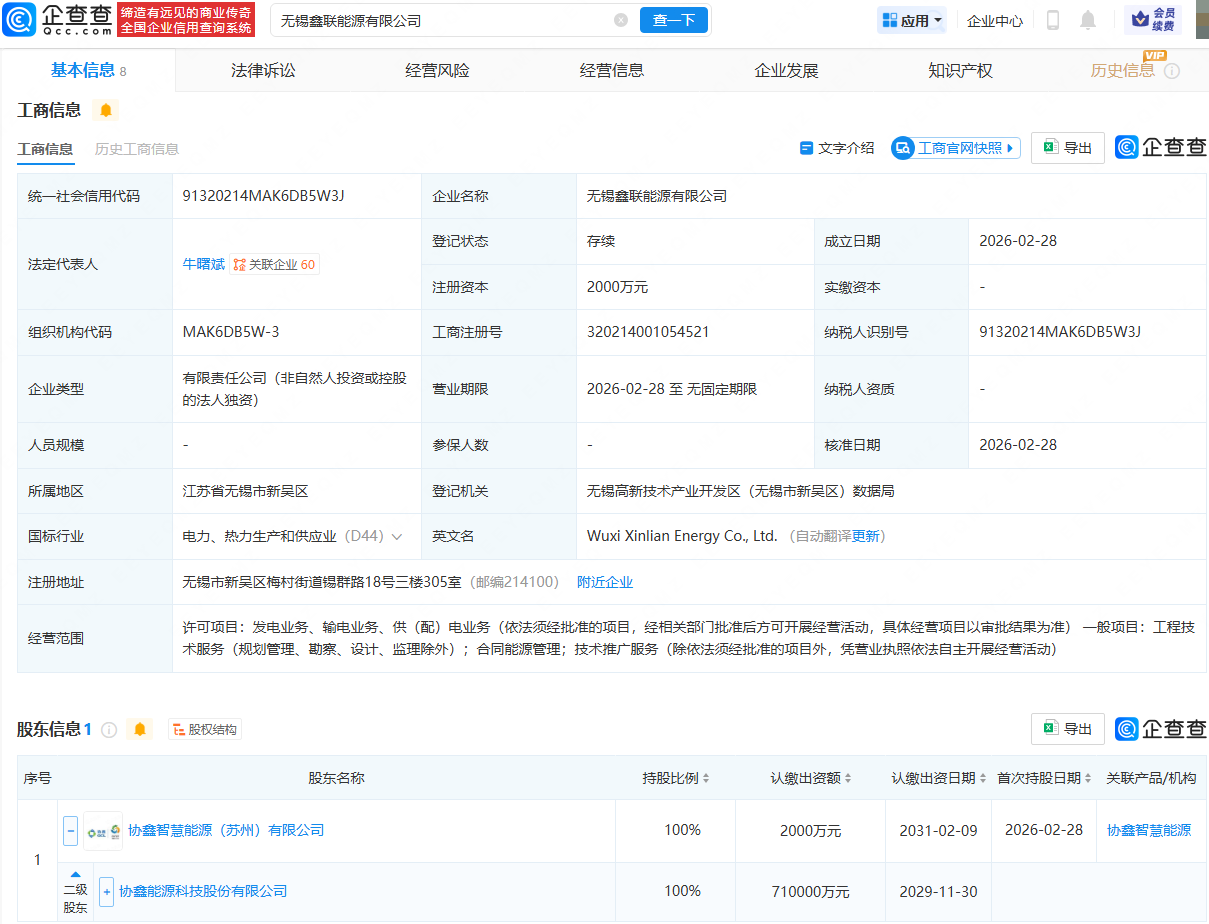 企查查APP显示,近日,无锡鑫联能源有限公司成立,法定代表人为牛曙斌,注册资本为2000万元,经营范围包含:发电业务、输电业务、供(配)电业务;合同能源管理;技术推广服务等。企查查股权穿透显示,该公司由协鑫能科(002015)间接全资持股。