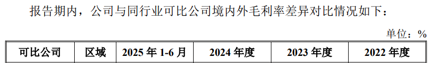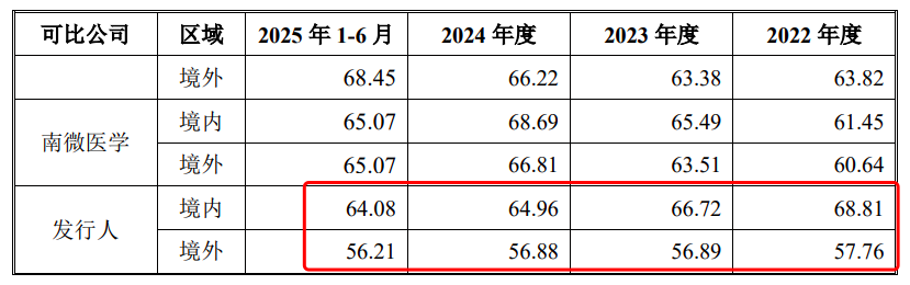 根据二轮回复资料显示,科莱瑞迪境内业务毛利率要高于境外,2022年至2025年上半年,公司境内业务毛利率分别为68.81%、66.72%、64.96%、64.08%,境外业务毛利率分别为57.76%、56.89%、56.88%、56.21%,前者比后者高7.8至11.1个百分点。