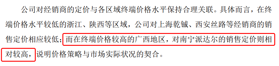 科莱瑞迪在二轮回复中还提到,公司对经销商的定价与各区域终端价格水平保持合理关联。具体而言,在终端价格水平较低的浙江、陕西等区域,公司对上海乾铖、西安丝路等经销商的销售定价相应较低;而在终端价格较高的广西地区,对南宁派达尔的销售定价则相对较高,说明价格策略与市场实际状况的契合。