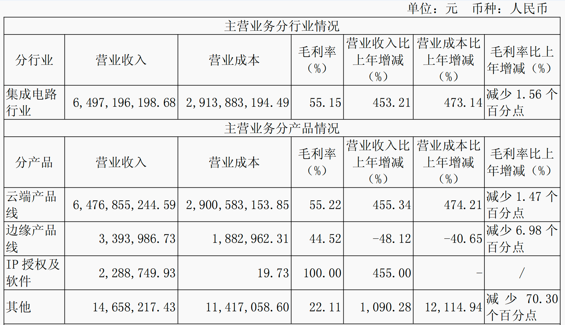 从产品的营收情况来看,云端产品线和IP授权及软件两类产品的营业收入增速较快,均达到了455%,前者的毛利率为55.22%,同比上一年减少了1.47个百分点,后者的毛利率达到了100%。而边缘产品线的营业收入同比上年减少了48.12%,毛利率为44.52%,同比减少了6.98个百分点。