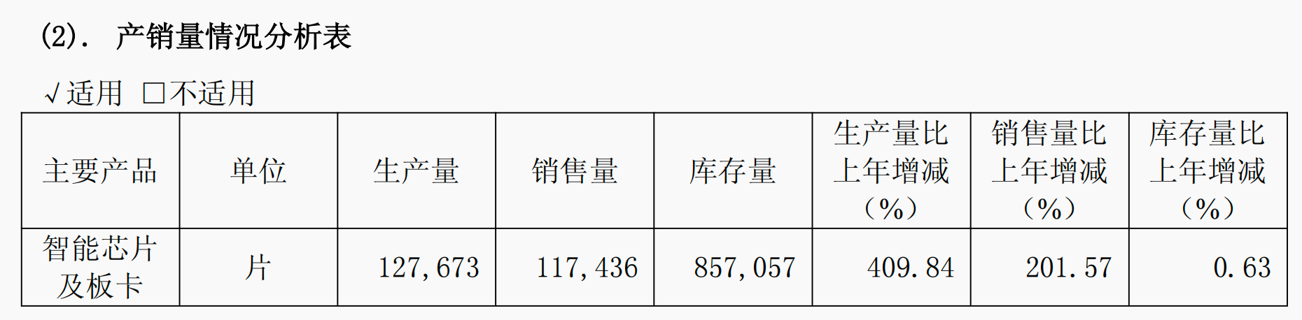 2025年,寒武纪的智能芯片及板卡的生产量为12.77万张,同比增长409.84%;销售量为11.74万张,同比增长201.57%;库存量为85.71万张,同比增长0.63%。