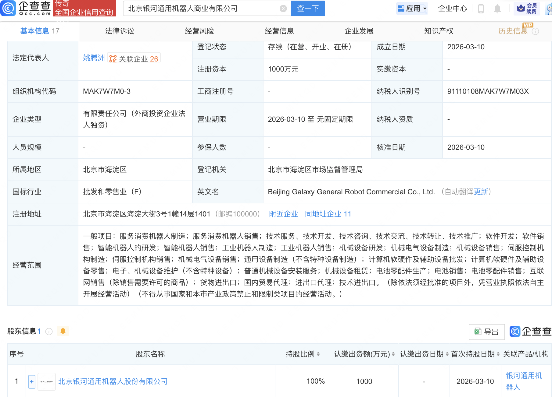 企查查APP显示,近日,北京银河通用机器人商业有限公司成立,注册资本1000万元,经营范围包含:智能机器人销售;工业机器人制造;工业机器人销售;机械设备研发;机械电气设备制造等。企查查股权穿透显示,该公司由北京银河通用机器人股份有限公司全资持股。
