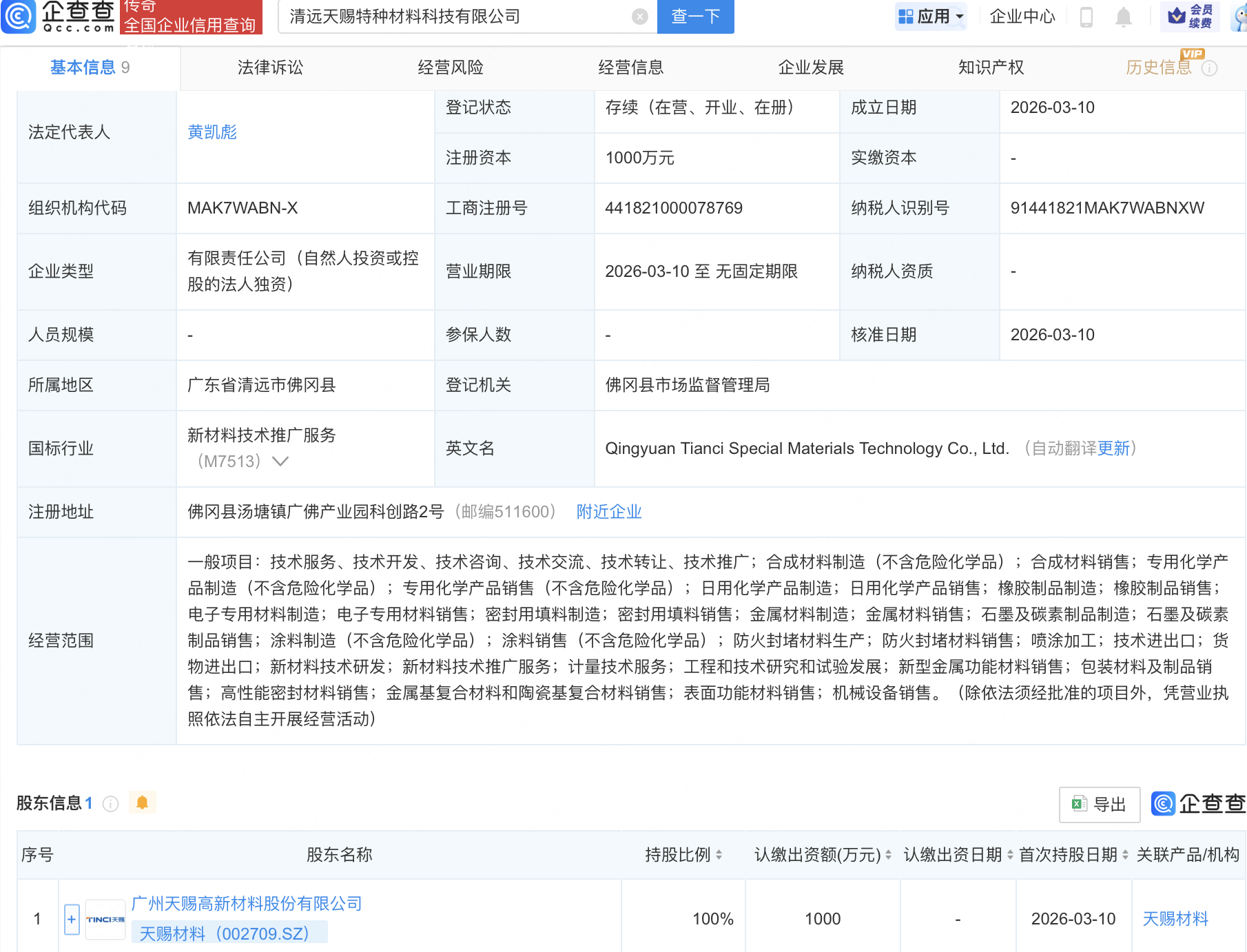 企查查APP显示,近日,清远天赐特种材料科技有限公司成立,注册资本1000万元,经营范围包含:高性能密封材料销售;金属基复合材料和陶瓷基复合材料销售;表面功能材料销售;机械设备销售等。企查查股权穿透显示,该公司由天赐材料(002709)全资持股。