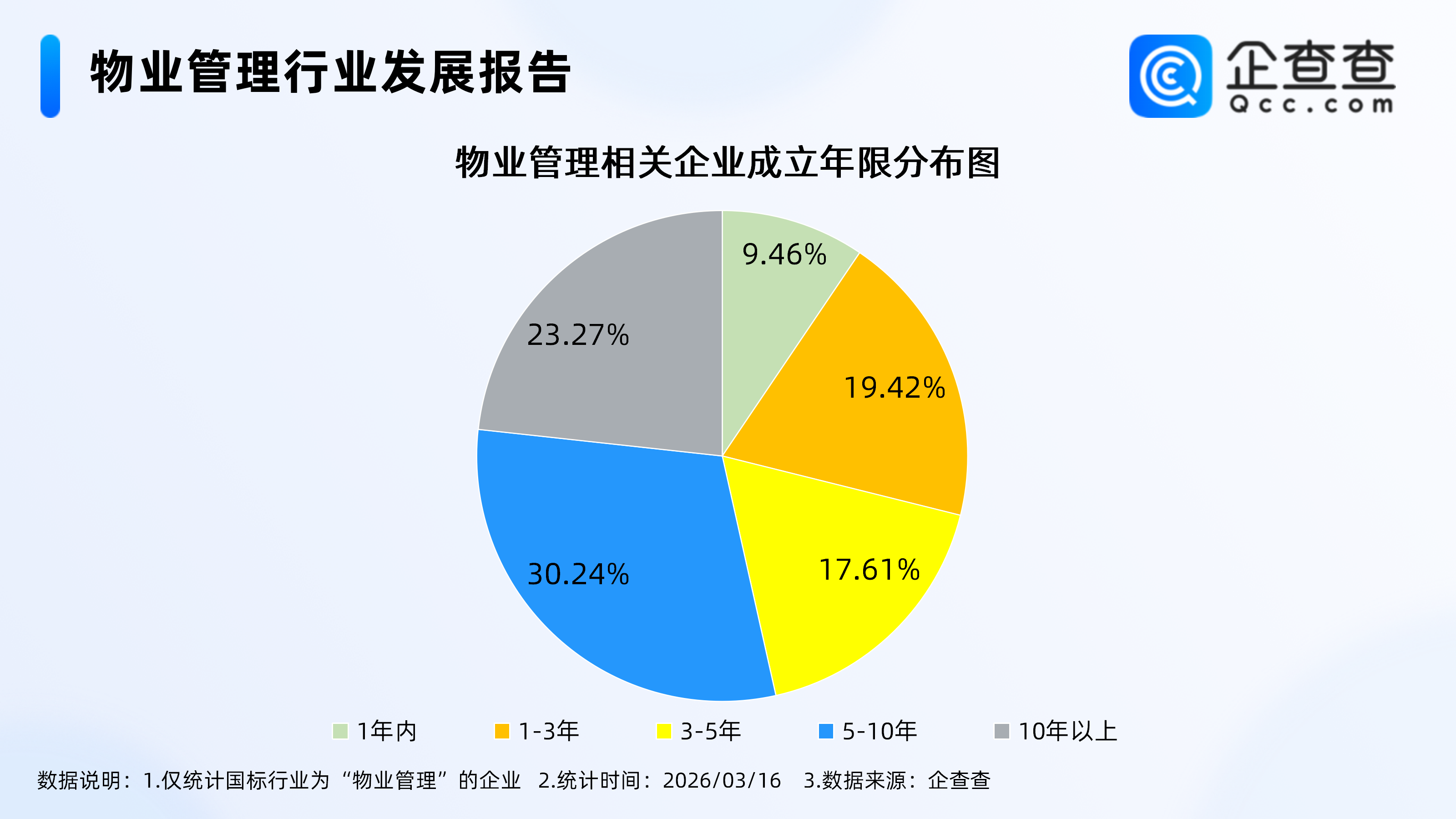企查查数据显示,截至3月16日,国内现存59.56万家物业管理相关企业。近十年,我国物业管理相关企业年末存量呈现持续稳健增长态势,行业规模不断扩大。2016年末存量为24.40万家,2025年末存量增长至59.29万家,十年间企业数量增幅达143.0%。从企业成立年限分布来看,成立5-10年的企业占比最高,达30.24%。从区域分布来看,华东地区以31.77%的占比稳居首位。