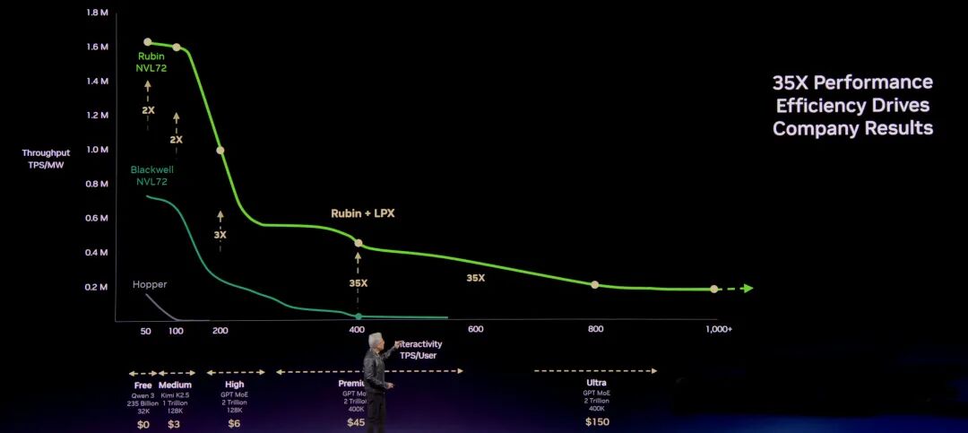 除此之外,NVIDIA推出的Groq 3 LPX机架专门针对低延迟、长上下文的代理系统设计,凭借其500MB片上SRAM和40 PB/s的显存带宽,能够绕过外部显存,实现几乎瞬时的Token产出与Blackwell平台相比,这种联合设计实现了35倍的每瓦特推理性能提升。