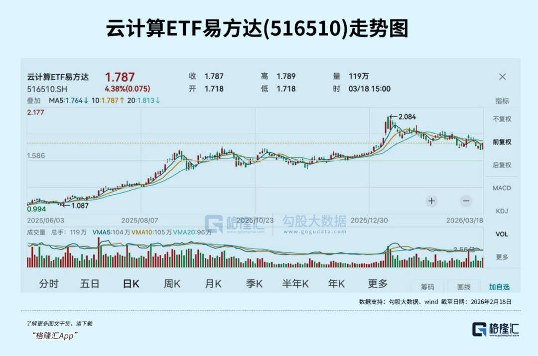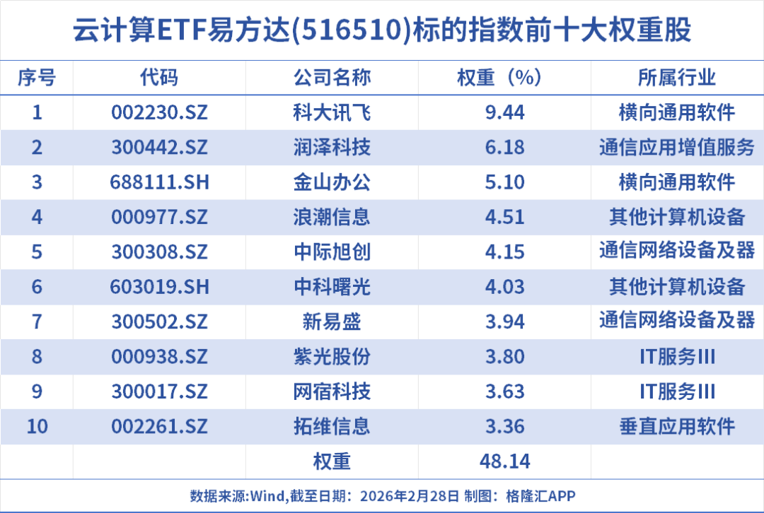 云计算ETF易方达(516510)最新规模25.64亿元,居同标的ETF第一,综合费率0.2%/年,同类最低,助力投资者低成本布局云计算产业链龙头;其跟踪中证云计算与大数据主题指数,标的指数囊括AI上游基建、中游模型、下游应用,成份股覆盖光模块龙头中际旭创、新易盛;电子终端及组件龙头中科曙光、浪潮信息;软件开发龙头科大讯飞、金山办公;IT服务紫光股份、润和软件等公司。