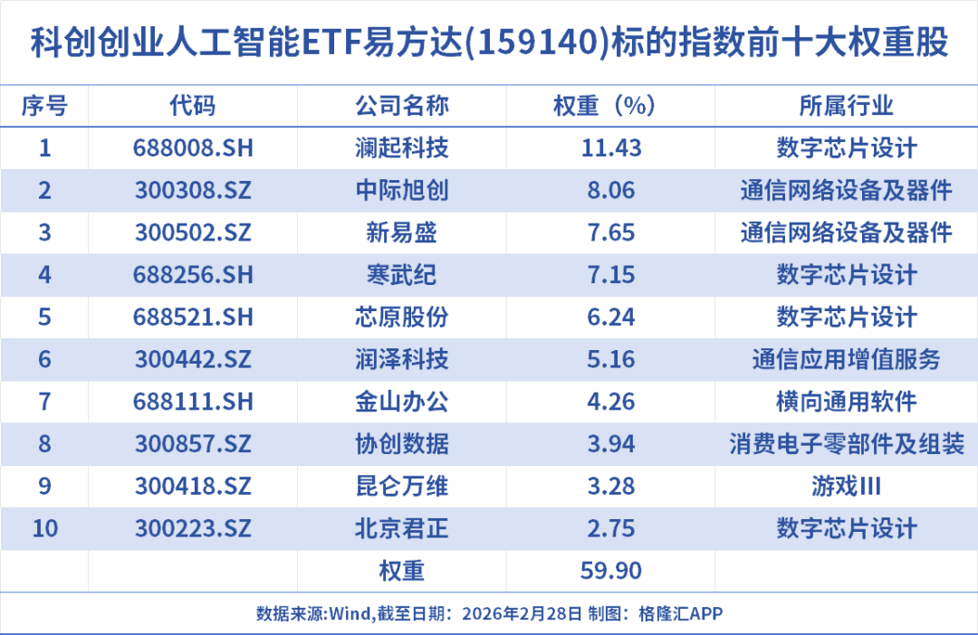 科创创业人工智能ETF易方达(159140)跟踪中证科创创业人工智能指数,覆盖通信、电子、计算机等人工智能相关赛道,三大行业合计占比87.91%;权重股为澜起科技、中际旭创、新易盛、寒武纪、芯原股份、润泽科技、金山办公等,聚焦光模块和国产AI芯片龙头,前十大成份股合计占比60%,集中度较高。