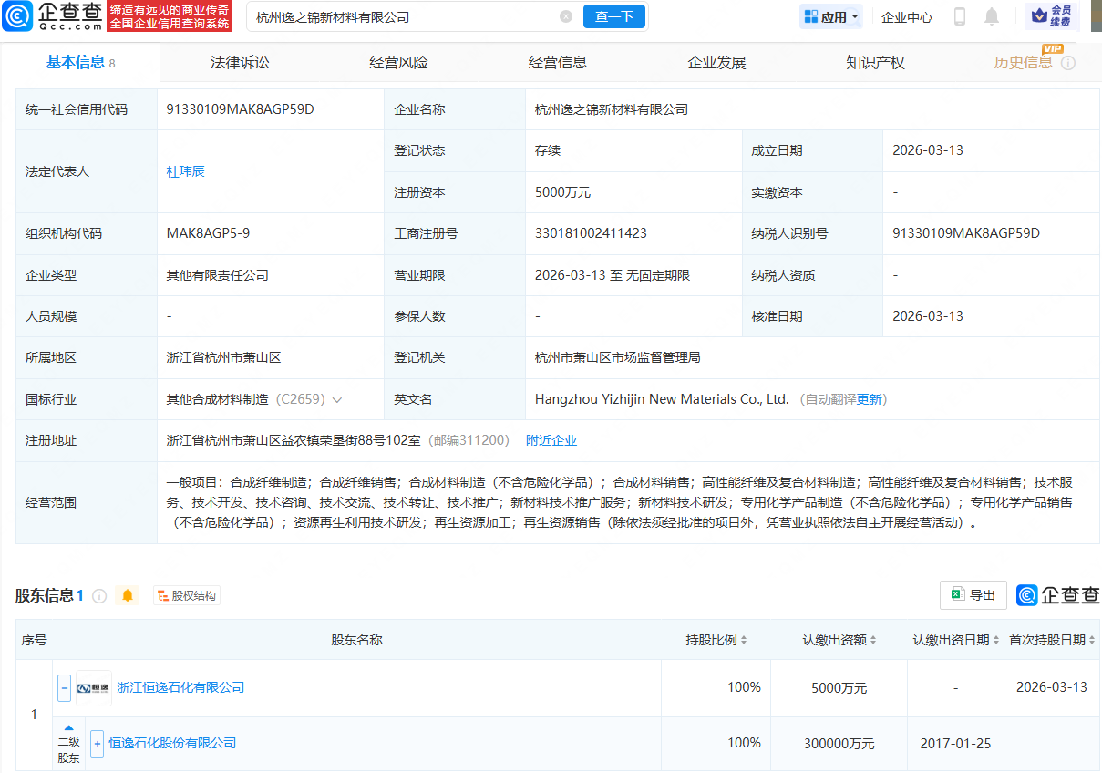 企查查APP显示,近日,杭州逸之锦新材料有限公司成立,法定代表人为杜玮辰,注册资本为5000万元,经营范围包含:合成纤维制造;合成材料制造(不含危险化学品);高性能纤维及复合材料制造;新材料技术研发等。企查查股权穿透显示,该公司由恒逸石化(000703)间接全资持股。