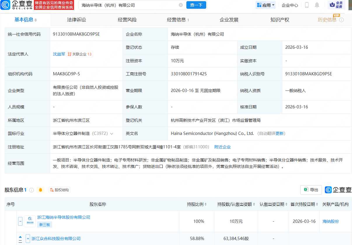企查查APP显示,近日,海纳半导体(杭州)有限公司成立,法定代表人为沈益军,经营范围包含:半导体分立器件制造;电子专用材料研发;非金属矿物制品制造;电子专用材料销售等。企查查股权穿透显示,该公司由众合科技(000925)旗下浙江海纳半导体股份有限公司全资持股。