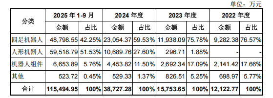 此前多年,宇树的收入主要依赖单价较低的四足机器人(俗称:机器狗)。这一格局在 2025 年被打破,人形机器人销售收入有望超越四足机器人;仅 2025 年前九个月,人形机器人收入占比已达 51.53%,撑起公司半壁江山。