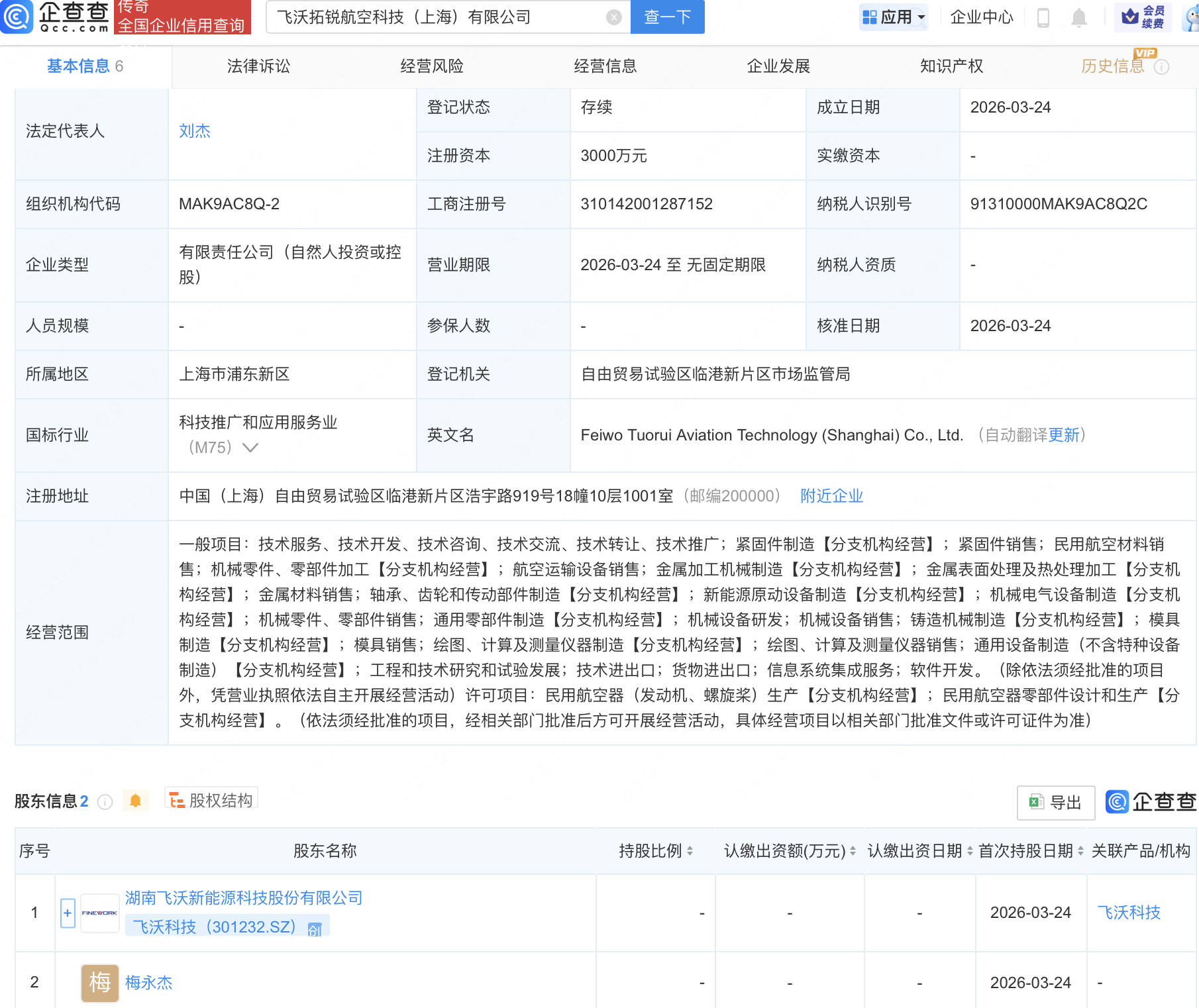 企查查APP显示,近日,飞沃拓锐航空科技(上海)有限公司成立,注册资本3000万元,经营范围包含:紧固件销售;民用航空材料销售;航空运输设备销售等。企查查股权穿透显示,该公司由飞沃科技(301232)等共同持股。