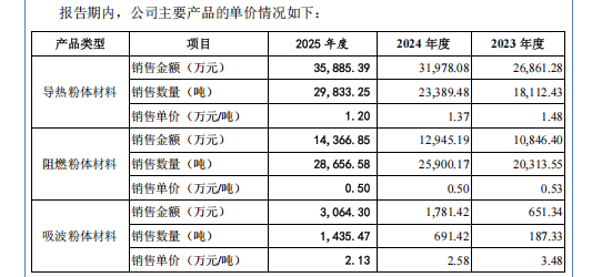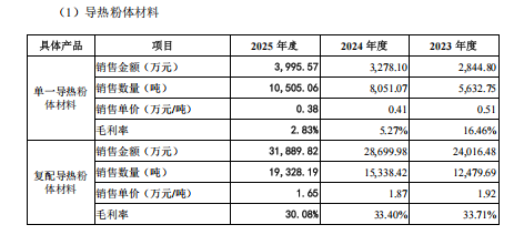 2022 年至 2025 年,单一导热粉体销量从 0.53 万吨 / 年大幅增长至 1.05 万吨 / 年,复配导热粉体销量从 1.44 万吨 / 年增至 1.93 万吨 / 年,正是依靠销量扩张才实现了利润增长。