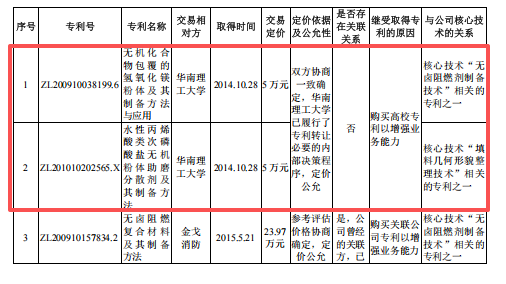 不过,除了这些神秘配方外,金戈新材其他技术实力存疑。招股书中列为核心技术的 “填料几何形貌整理技术”,涉及专利为 “水性丙烯酸类次磷酸盐无机粉体助磨分散剂及其制备方法”;另一项核心技术 “无卤阻燃剂制备技术”,涉及专利为 “无机化合物包覆的氢氧化镁粉体及其制备方法与应用”。两项专利均为 2014 年从华南理工大学受让取得,转让对价均为 5 万元。