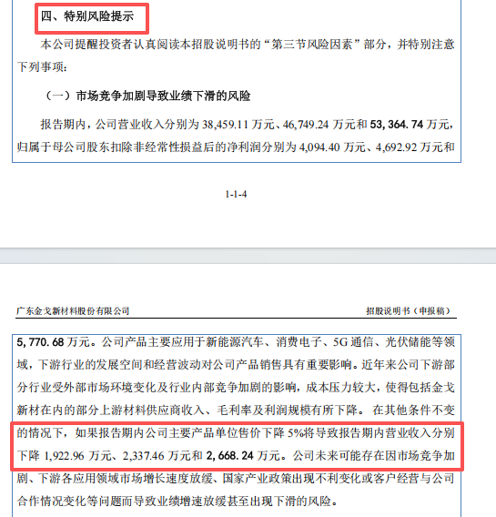 值得注意的是,公司在招股书开篇的特别风险提示中披露了价格敏感性测试。企业在问询回复中开展敏感性测试较为常见,但将其列入特别风险提示的情形并不多见。